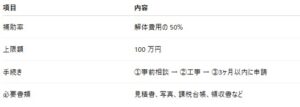 ・解体および処理にかかる経費の2分の1以内(1,000円未満切り捨て)、上限100万円