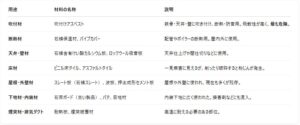 アスベストは、その優れた耐熱性・絶縁性・強度から、かつて非常に多くの建材や製品に使用されていました。以下に、アスベストが含まれていた代表的な材料を用途別にまとめます。