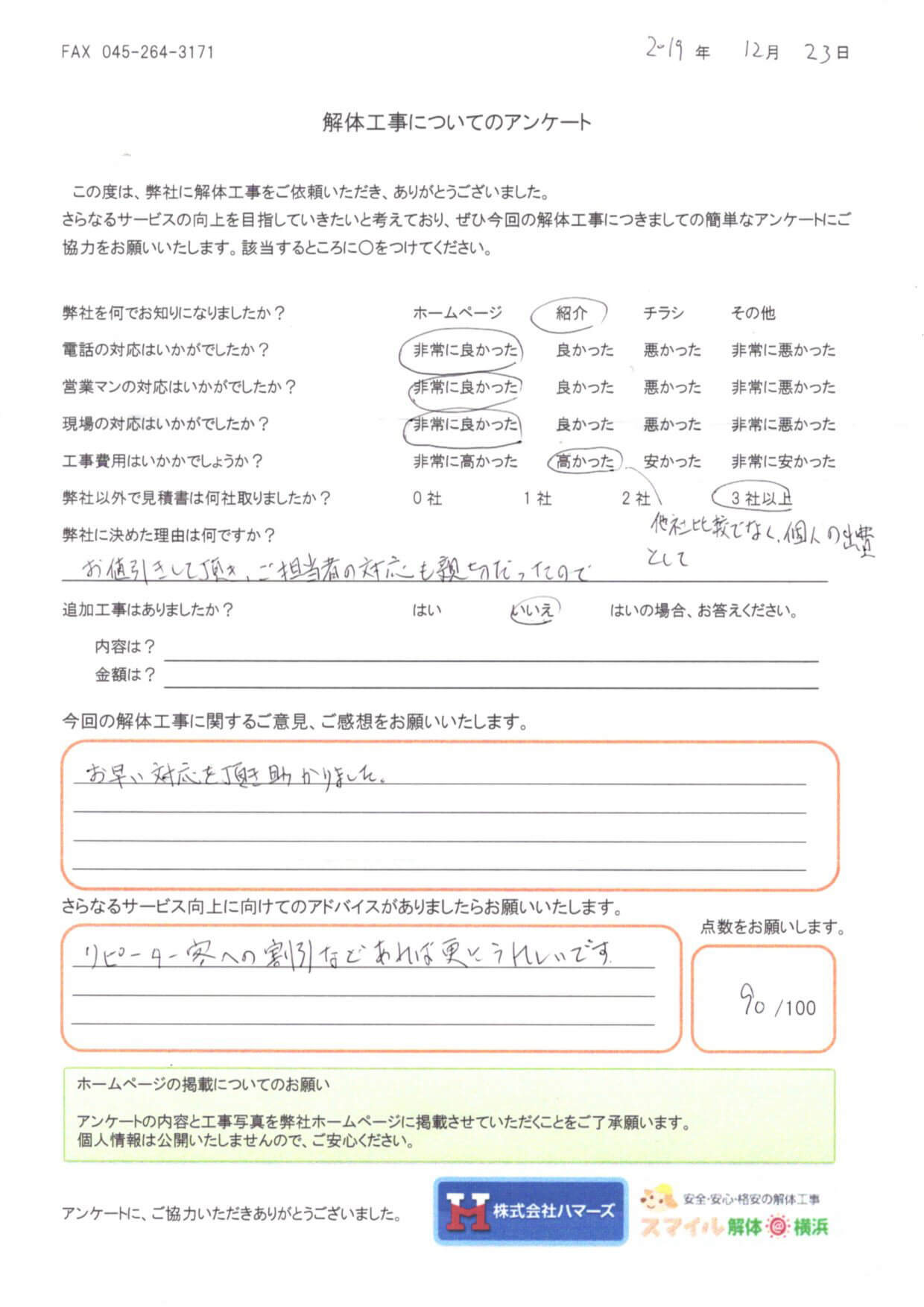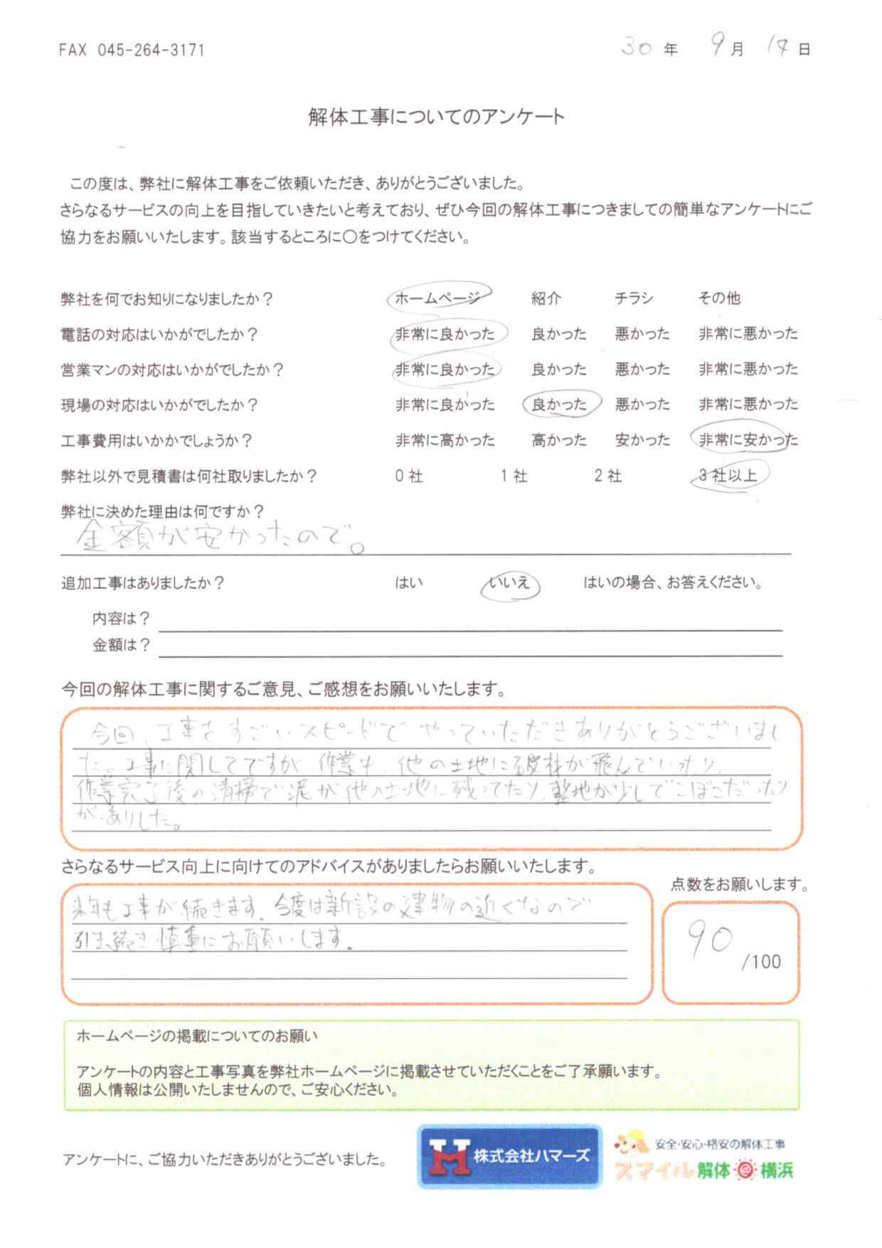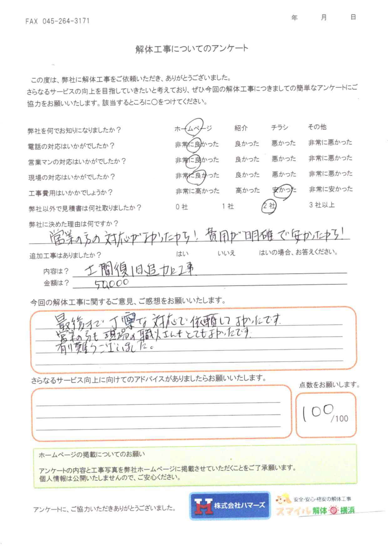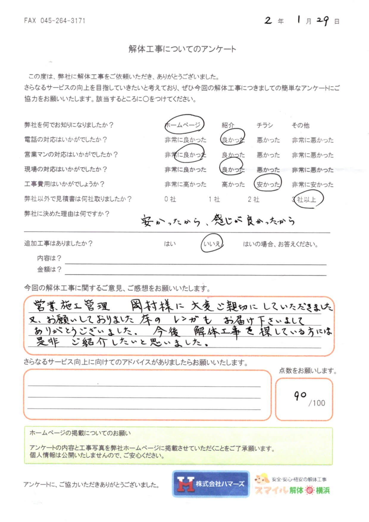 - 弊社に決めた理由はなんですか?・・・金額は高いものでしたが、他社と比べて安かったから。
