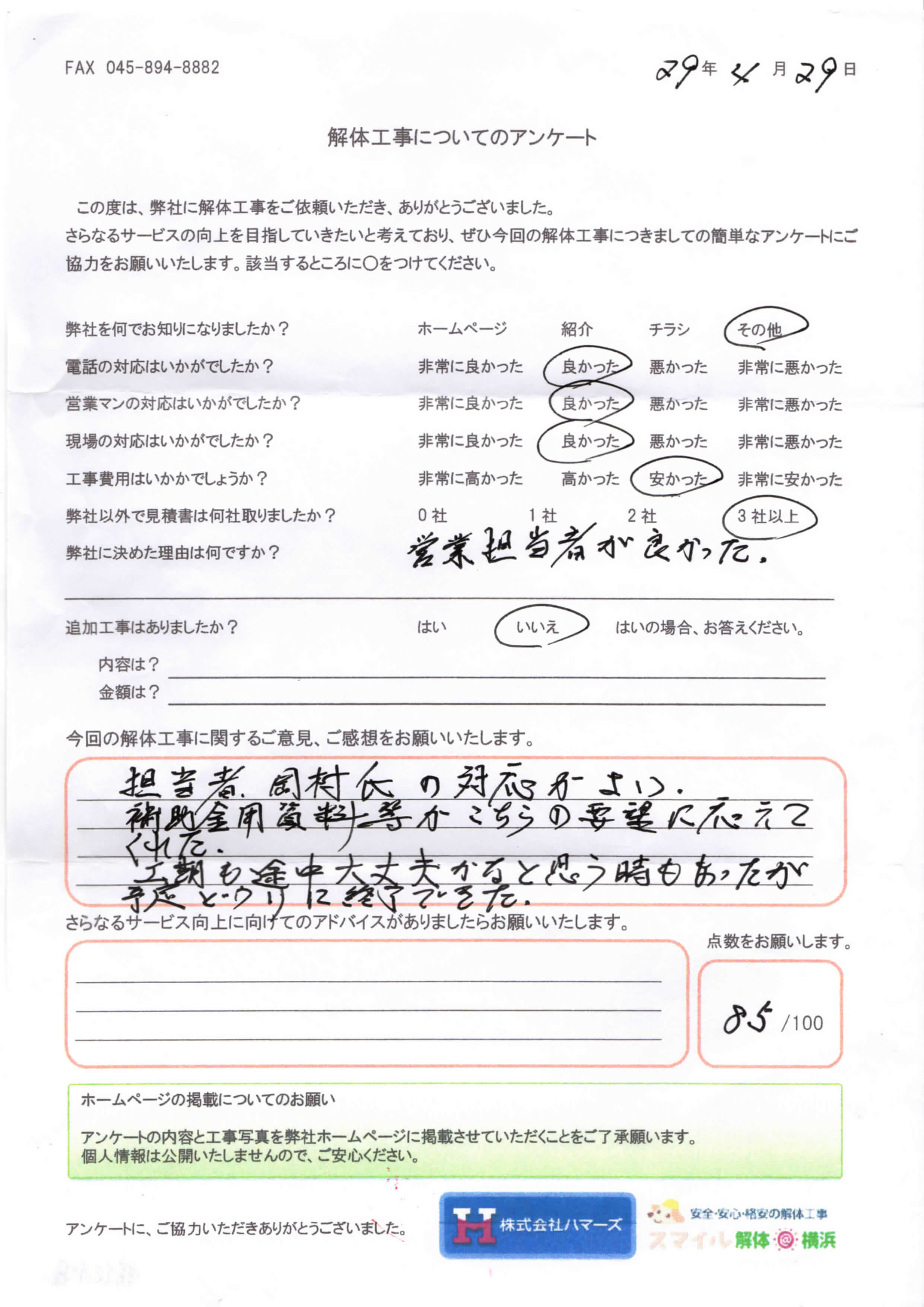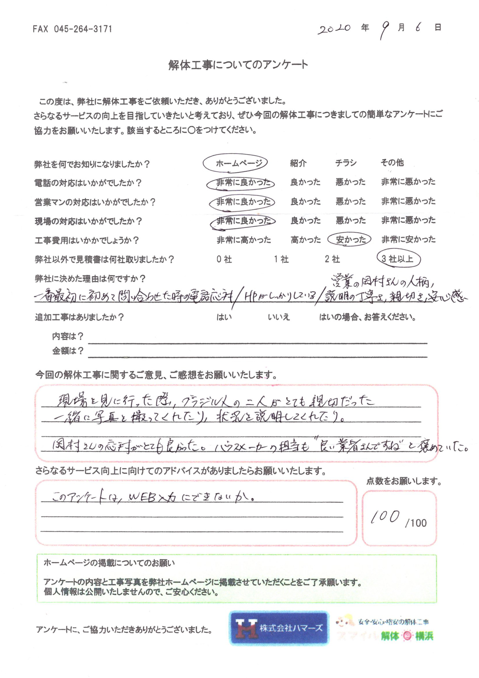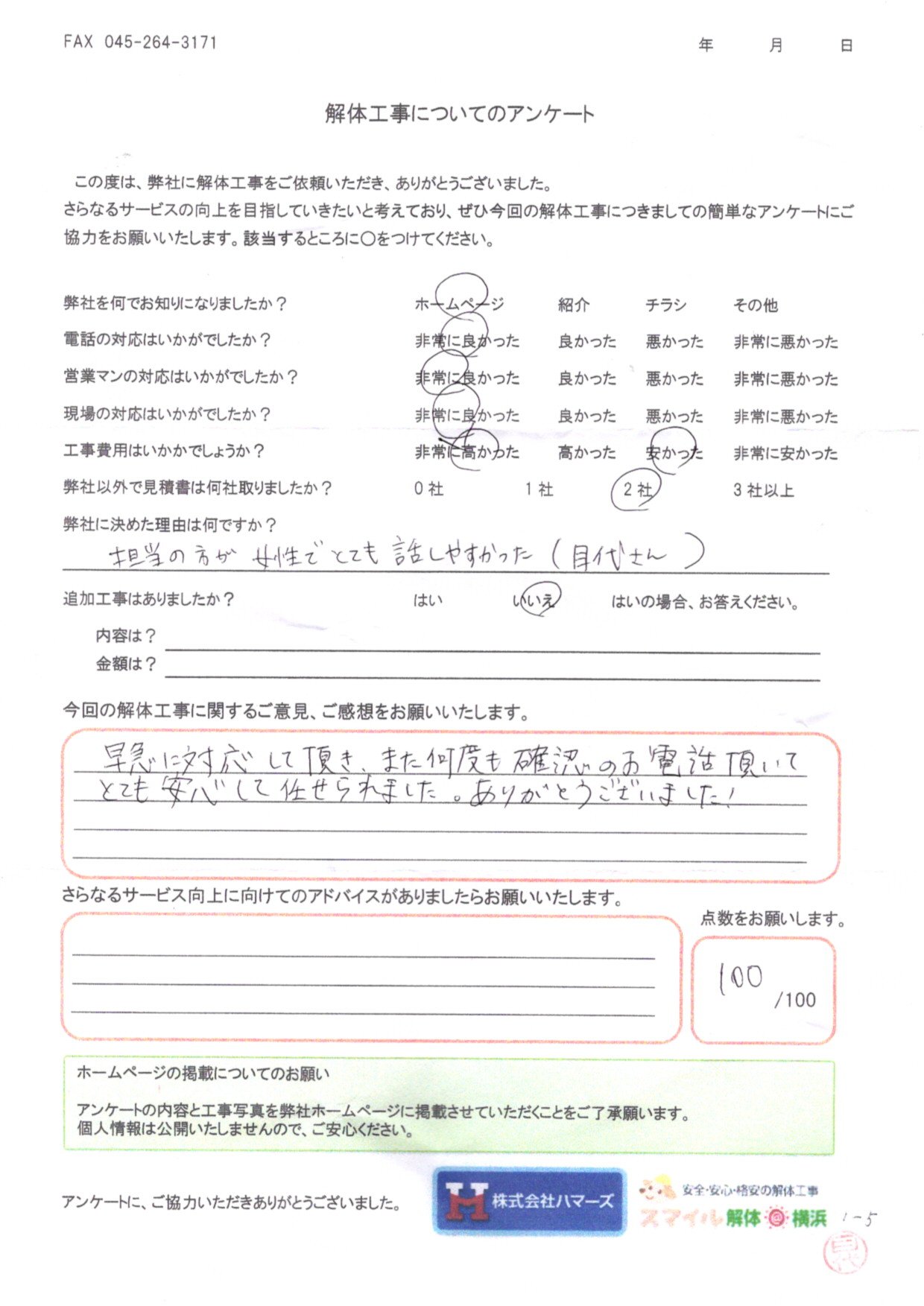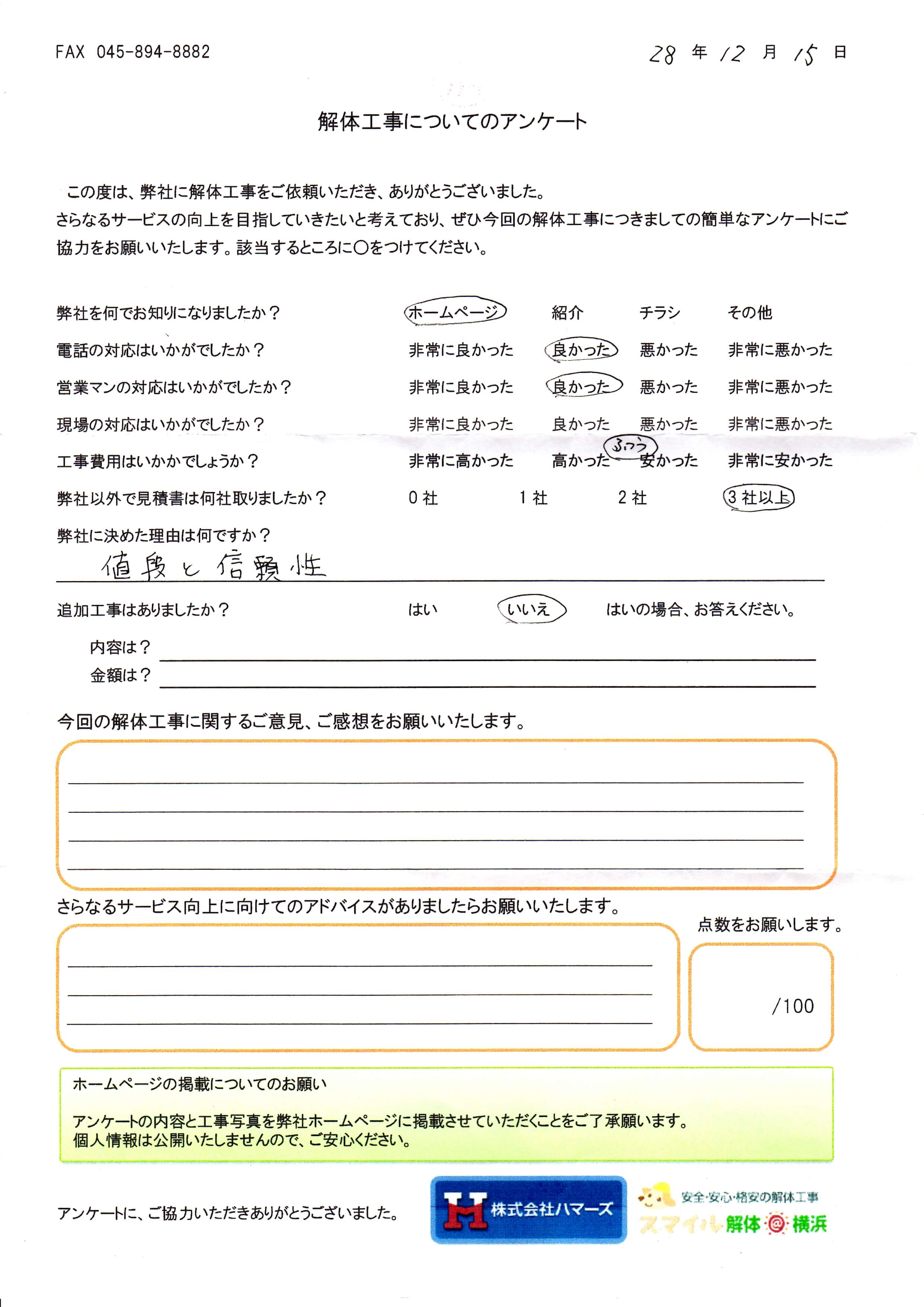- 弊社に決めた理由はなんですか?・・・金額は高いものでしたが、他社と比べて安かったから。